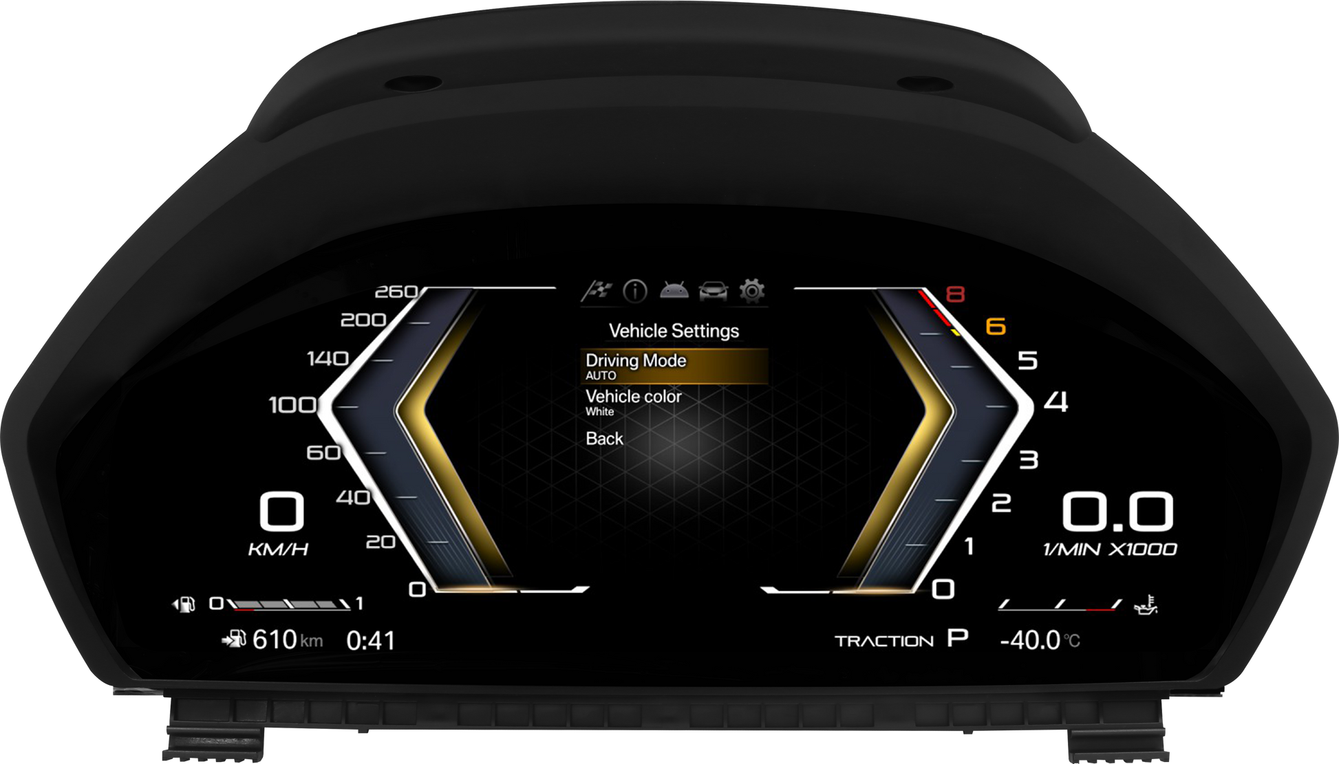 • Unterstützt die Anzeige von Fahrzeuginformationen wie Drehzahl, Geschwindigkeit oder Kraftstoffstand.