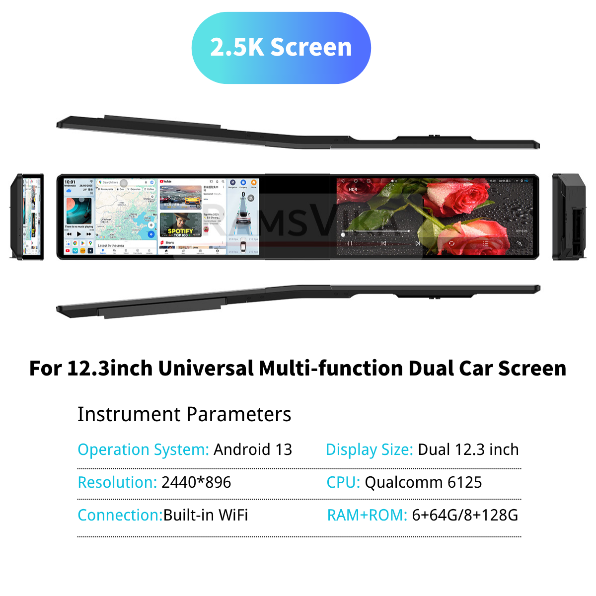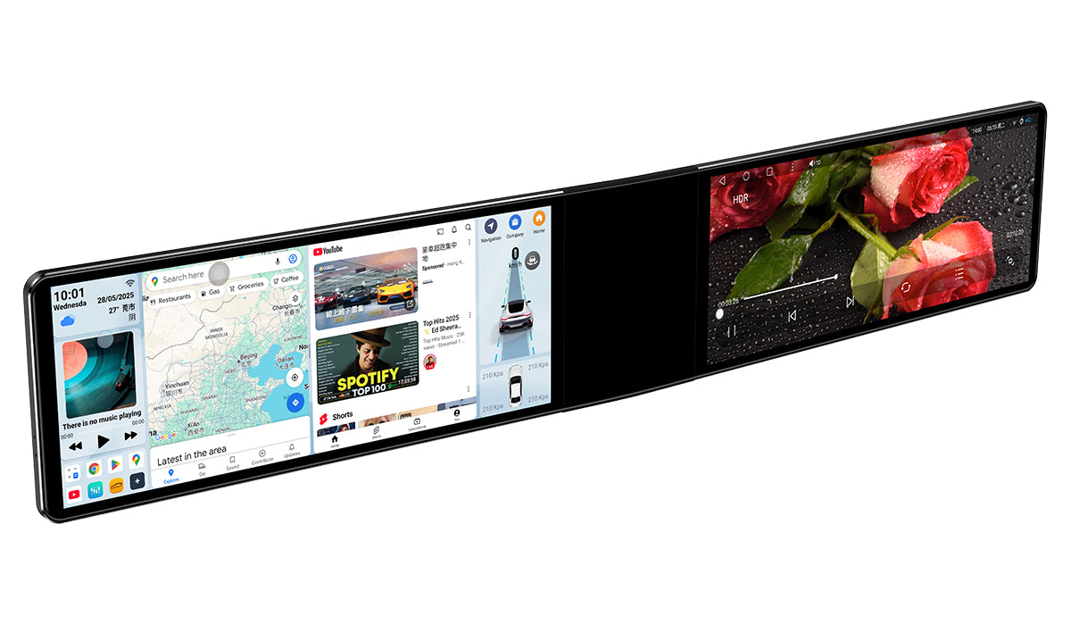 * 【HD screen】Experience next-level in-car entertainment with this dual screen car stereo featuring two ultra-wide 12.3-inch 2.5K strip screens (2440×896). Designed for modern vehicles, this dual car screen setup offers smooth, synchronized performance between displays—perfect for navigation, media, and multitasking.