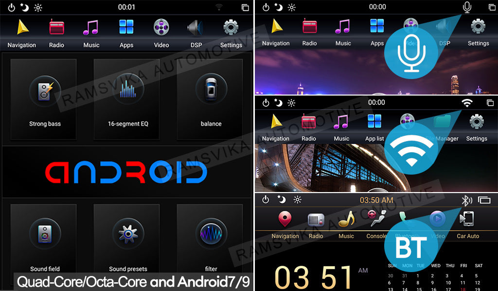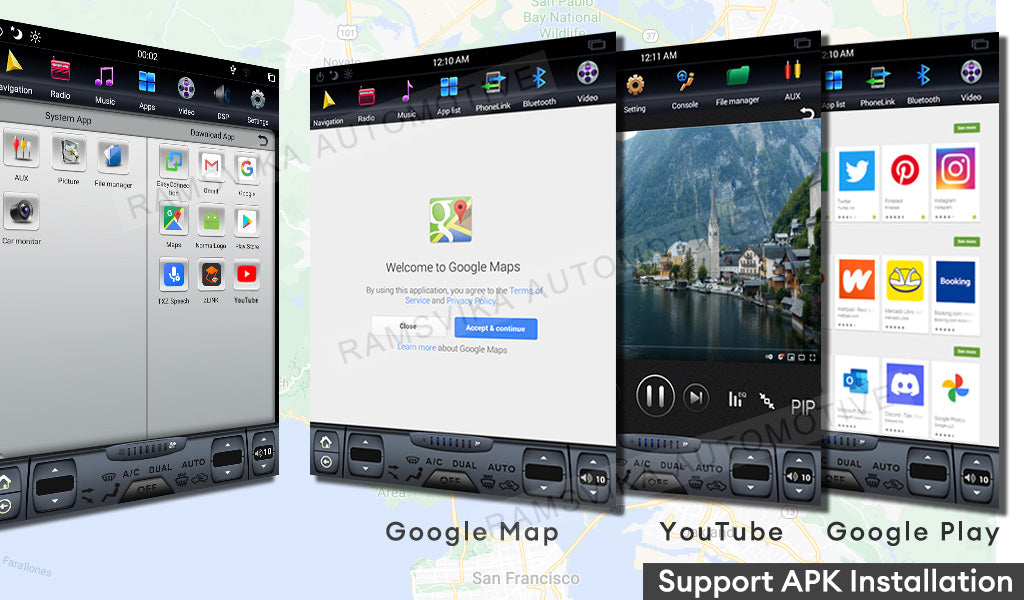 The Android radio is an Android tablet that includes the ability to install Android apps such as GPS navigation from any APK you prefer to. Other features include the ability to connect MirrorLink with iPhone or Android phones, Wi-Fi connectivity, Bluetooth music and phone calls, AM/FM radio, etc, while most OEM features are retained. Additional accessories such as Bluetooth adapter, digital TV tuner, USB DVD player, backup camera, etc.